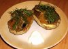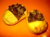 Картофель вымыть и отварить в кожуре. Дать немного остыть, очистить. Разрезать вдоль и ложкой вынуть мякоть из серединки, чтобы получились лодочки. Лук и грибы мелко порезать, обжарить лук в масле, добавить к нему грибы. Тушить пока не выпарится жидкость, потом положить нарезанную кусочками картофельную мякоть, посолить, поперчить, посыпать приправами. Половинки картофеля заполнить фаршем, сверху обмазать майонезом.