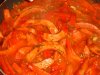Лук очищаем и крупно режем – именно крупно, не полукольцами, а крупными кусками. Болгарский перец тоже режем крупно. Разогреваем в сковородке растительное масло и выкладываем лук. Подождем пока станет полупрозрачным, добавляем в сковородку болгарский перец. Когда появится характерный запах поджаренного перца, пришла очередь положить к овощам колбаски. Они тоже должны быть нарезаны крупными кусками. Обжариваем все вместе минут 5 – 7.