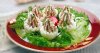 Вот как можно красиво подать это блюдо: в широкое блюдо выкладываем свежие салатные листья или любую другую свежую зелень. Сверху кладём половинки фаршированных грибами яиц.