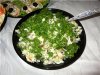 В красивый салатник выкладываем на дно салатные листья, а сверху накладываем наш салат.