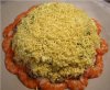 Далее яйца + майонез, не забываем трамбовать (придавливаем и уплотняем). Затем идёт лучок + немного майонеза. Далее яблоки и половина банки лосося (его необходимо вилочкой размять). Хорошенько ещё раз утрамбовываем салат в кольце.