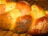 Смазать яйцом (его смешать с молоком), посыпать кунжутом и выпекать при температуре 220 градусов 15 минут.