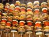 Сочетание продуктов не критично. Можно подобрать их по своему вкусу или сделать разные варианты. Например, если к овощам добавить кусочки брынзы, то получится греческий салат на шпажках. Подойдут кусочки обжаренных сосисок или кусочки мяса, отварной птицы. Все овощи режутся крупными кусочками, маленькие помидорки оставляются целыми или разрезаются на половинки. Лук – кружочками, на колечки его разбирать не нужно. На шпажку нанизываются продукты в произвольном сочетании или можно использовать сочетание цветов или продуктов – например, брынза и помидорка или лук и мясо.