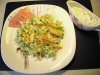 Куриное филе отварить в подсоленной воде до готовности. Остудить, разобрать на волокна или нарезать небольшими кусочками. Отварить яйца, мелко нарезать. Если огурцы с тонкой кожицей, чистить не обязательно, грубую кожицу снять. Нарезать кубиками как на обычный салат. Измельчить зеленый лук, мелко нарезать зелень петрушки и укропа. Болгарский перец разрезать пополам, удалить семена и разрезать каждую половинку на две части. Сыр или брынзу мелко нарезать.