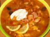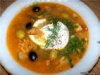 Потом положите в солянку припущенные огурцы, измельчённые рыжики, кроме того, оливки и каперсы. Доведите суп до кипения и варите его ещё в течении 10-15 минут на медленном огне. За 1-2 минуты до того, как закончите варить солянку, положите сметану. Курицу можете положить, заранее обжарив её в масле.