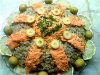 Для этого салата все ингредиенты режутся тонкой соломкой. Из сырых яиц с добавлением молока и соли делается омлетная смесь. На разогретой сковородке с небольшим количеством масла выпекаются тоненькие блинчики. Затем нарезаются тонкой соломкой как лапша.