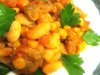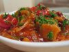 В другой сковородке разогреть масло, обжарить до румяного цвета лук, добавить болгарский перец и обжаривать все вместе пять минут. В глубокую толстостенную кастрюлю или в казанчик выложить мясо и овощи (овощи на дно), посолить, приправить перцем красным и черным, тмином, положить лавровый лист. Влить вино, бульон и поставить на маленький огонь. Бульона нужно добавить столько, чтобы он только покрыл мясо. Дать покипеть несколько минут и положить нарезанные кубиками помидоры.