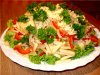 Белую часть лука – порея нарезать тонкими полукольцами. Капусту нашинковать, морковь можно нарезать брусочками или натереть на крупной терке. Перец нарезать соломкой. Помидоры для этого салата лучше выбирать мелкие – черри, если будут крупнее, то нарезать половинками или дольками. Сложить нарезанные овощи в салатник, добавить зелень, залить заправкой, перемешать. Накрыть пищевой пленкой, оставить в тепле минут на десять, затем убрать в холодильник на полчаса - салату нужно дать время настояться.