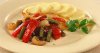 Пока варится картофель, нарезать тонкими брусочками свеклу и обжарить в небольшом количестве растительного масла. Добавить томатную пасту, сахар, присолить и тушить до готовности. В самом конце влить уксус.