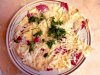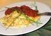 Лук нарезать тонкими кольцами, кабачок – кружочками. Разогреть в сковородке растительное масло, обжарить лук до золотистого цвета. Шумовкой переложить на тарелку. В этом же масле обжарить до готовности кабачки, снять в тарелку, подсолить.