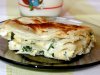 После этого надо завернуть концы лаваша и сформировать лаваш. После этого пирог залить смесью из кефира (полстакана) и одного яйца. Ставим выпекать примерно на тридцать пять минут, температура в печи должна быть от ста семидесяти пяти до двухсот градусов. Верх пирога должен зарумяниться. Готовый пирог надо нарезать на кусочки и выложить на блюдо.