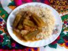 В глубокую тарелку насыпать муку. Мясо вымыть, обсушить бумажным полотенцем, нарезать небольшими кусочками. Обвалять в муке. В сковородке разогреть растительное масло, обжарить мясо до румяной корочки. Переложить в кастрюлю, добавить перец, лавровый лист, влить воды столько чтобы она слегка прикрывала кусочки мяса. Накрыть крышкой и на небольшом огне тушить до мягкости мяса.
