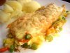 Рыбу вымыть, разделить на филе, обсушить. Посолить, посыпать перцем, приправами, полить лимонным соком и маслом и оставить мариноваться. Морковку нарезать произвольно – небольшими кубиками, кружочками, но резать не крупно, чтобы она успела приготовиться. Лук нарезать полукольцами.