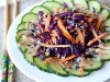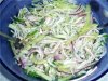 Огурцы для этого салата нужно резать очень тонкой соломкой, а свеклу тереть на терке. Идеально подойдет для приготовления терка для корейской морковки, но свеклу в любом случае лучше натирать на обычной терке.