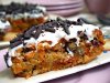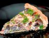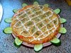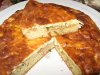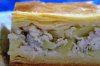 Готовим тесто. Венчиком взбить яйца, добавить сметану и майонез, размешать. Всыпать просеянную муку, разрыхлитель, соль, венчиком вымешать однородное тесто без комочков. По консистенции оно должно напоминать густую сметану. Вылить тесто на начинку. Поставить пирог в разогретую до 190 градусов, выпекать пока верх не подрумянится. Готовый пирог достать, накрыть блюдом и перевернуть. Остудить, нарезать на порционные кусочки.