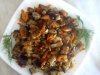 Баклажаны очистить от кожицы, разрезать поперек на две части, нарезать вдоль полосками шириной около двух сантиметров. Засыпать столовой ложкой крупной соли, слегка помять, перемешать и оставить на несколько часов, можно даже на ночь. Баклажаны должны отдать горький сок и потемнеть.