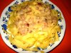 Воду с макарон слить, макароны откинуть на дуршлаг, дать стечь воде. Положить в соус, перемешать, посыпать тертым сыром и запечь в духовке при температуре 180 градусов. Время запекания – 15 минут. Посыпать зеленью и подавать к столу.