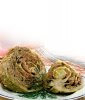 Выкладываем начинку на тортильяс, края смазываем соком от томатов и складываем конвертиком. Сверху поливаем соусом, посыпаем чеддером и запекаем пару минут в духовке.