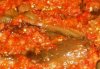 4. Выложить в миску слой баклажан, затем налить аджику, затем опять баклажаны и аджика. Дать выстояться около четырех часов.