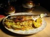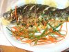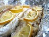 Лимон режем дольками, закладываем в середину рыбки и сверху. Заворачиваем рыбу в фольгу (не слишком плотно), укладываем на противень и ставим в горячую духовку. Запекаем на среднем огне сорок – пятьдесят минут. Рыба при таком способе приготовления остается сочной, но не жирной – весь жир стекает в фольгу. При желании можно на фольге сделать подушку из картофеля (его не забыть посолить и поперчить) и лука, а сверху уложить рыбу. Завернуть и запечь.