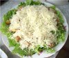 Для соуса в сметану добавляем горчицу, пропущенный через чесночницу чеснок, щепотку соли и хорошо взбиваем. Добавляем маринованный огурец, перемешиваем и поливаем соусом салат. Сверху посыпаем сыром, сухариками и подаем к столу.