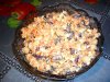 Корнишоны или огурчики нарезать маленькими кружочками. Смешать обжаренные овощи, огурцы, ветчину, добавить банку фасоли вместе с соусом. Хорошо перемешать салат, убрать в холодильник чтобы немного пропитался. Перед подачей к столу посыпать сверху сухариками или разложить по тарелкам и добавить сухарики к каждой порции.
