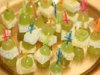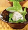 слабосоленая красная рыбка, кружочки оливок или маслин, зернышки консервированной кукурузы, свежая зелень.