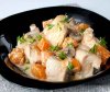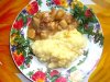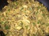 Филе и морковку нарезаем мелкими кубиками. Лук мелко режем и обжариваем до прозрачного цвета в небольшом количестве масла (можно в смеси сливочного и растительного). Добавляем морковку, обжариваем до полуготовности. Выкладываем кусочки куриного мяса, огонь увеличиваем, на сильном огне обжариваем до частичного испарения жидкости. Приправляем кориандром, приправой для курицы, солим по вкусу и выкладываем грибы. Если небольшие – оставить целыми, если крупноватые – предварительно режем кусочками. Грибы добавляем без жидкости.