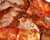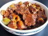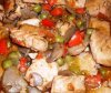Мясо надо промыть, после этого поделить его на кубики, присолить, добавить перец и муку, все хорошо вымешать. В сотейник положить граммов пятьдесят сливочного масла, затем выложить мясо и обжарить его, помешивая. Лук репчатый порезать полуколечками и также переложить к мясу, протушить около пяти - семи минут, после этого можно влить вино и тушить еще минут семь. Перец сладкий нарезать и переложить к мясу и еще протушить пять минут.