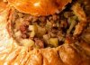 Надо сначала сварить картофель в шкурке, потом очистить и помять вилкой. Отдельно грудинку порезать на кусочки и обжарить. После этого ее надо выложить. Затем соединить картофель и половина пожаренной грудинки, добавить специи, яйцо, обжаренный лук, творог и две столовых ложки муки, присолить и поперчить, перемешать. Сделать котлеты.