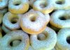 Готовое тесто обмять, разделить на небольшие кусочки. Сформировать круглые булочки, в середине сделать отверстие и выложить на смазанный маслом противень. Дать подойти, смазать желтком, посыпать сахаром и выпекать в разогретой до 180 градусов духовке до румяного цвета.