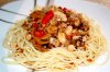Разогреть в сковородке растительное масло, выложить фарш, обжарить (комочки разбивать). Положить лук и тоже слегка обжарить. Приправить солью и перцем, добавить томатную пасту, чеснок, нарезанные кусочки помидор и перца. Довести до кипения, тушить десять минут.