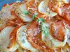 Яблоки разрезаем пополам, удаляем серединку, мякоть режем тонкими полукруглыми ломтиками. Также режем картофель, ломтики должны быть одинаковыми по толщине и размеру.