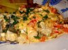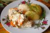 После этого надо лук почистить и нарезать полуколечками. Переложить лук в миску и налить кипяток. Дать постоять минут пять. За это время уйдет полностью горечь.