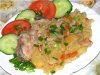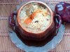 Выкладываем овощи на мясо, сверху засыпаем рис, вливаем воды столько чтобы она покрыла рис. Накрываем крышкой, делаем самый маленький огонь, тушим примерно час (рис должен впитать всю воду). Готовый плов посыпаем зеленью и даем настояться.