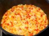 На другой сковородке обжариваем лук, потом к нему добавляем морковку, а когда немного обжарится, выкладываем кабачки, перец и еще обжариваем минут десять. В последнюю очередь кладем помидоры и чеснок. Солим по вкусу, приправляем специями.