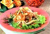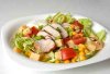 В порционные салатники выкладываем продукты слоями. Сначала капуста, потом огурцы, поливаем половиной соуса. Слой мяса с луком, помидоры, вторая половина соуса.