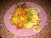 Отваренный картофель очистить, а зелёный лук нарезать колечками. Примерно за 5 минут до окончания тушения репки добавить туда же лук и картофель.