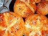Сверху булочки смазываем молоком (при помощи кисточки) и усыпаем щедро кунжутом. Затем на противне ставим их печься в духовку, запекаются булочки на йогурте пятнадцать минут (+/-) три минуты, при температуре плюс сто девяносто градусов.