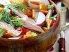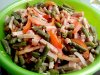 Делаем заправку. Перемешиваем майонез, кетчуп, апельсиновый сок. Предлагаемые пропорции – на три части майонеза по одной части кетчупа и апельсинового сока. Тщательно перемешиваем заправку, выливаем в салат. Даем немного настояться, перемешиваем, украшаем по желанию и подаем с жареными лепешками или с черным хлебом.