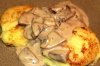 Соус. Нарезать лук и грибы, обжарить в масле. Влить сливки, добавить тертый сыр, мешать соус до полного растворения сыра. Влить вино, размешать, довести до кипения и варить соус на медленном огне пока он не загустеет.