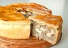 Вторую половину теста раскатайте на листе пергамента, переверните тестом на начинку и отделите бумагу. Края нижнего слоя теста закидываем наверх, формируем круглый пирог. В центре делаем отверстие, кладем туда масло, посыпаем верх пирога сахарной смесью. Выпекаем при температуре 170 градусов примерно 40 – 45 минут.