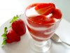 Сливки взбейте до устойчивых пиков, разделите пополам. Одну часть смешайте с клубничным пюре, вторую – с персиковым. В клубнично – сливочную смесь добавьте треть желатина, разложите по бокалам и уберите в холодильник. Минут через 15, когда желе немного схватится, по стенкам бокалов разложите ломтики клубники. Добавьте часть желатина в смесь из персика и сливок и разложите вторым слоем. Снова уберите в холодильник. Остатки желатина смешайте с отложенным клубничным пюре и выложите последним слоем. Посыпьте орешками и дайте застыть.