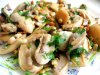 В той же сковородке обжарьте до румяного цвета нарезанный кубиками лук и смешайте его с печенкой. Лук и печенка должны остыть хотя бы до комнатной температуры, иначе вкус салата резко ухудшится.