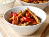 Две луковицы положите в блендер и измельчите до пюреобразного состояния. Оставшуюся луковицу нарежьте полукольцами, обжарьте до прозрачного цвета в двух столовых ложках растительного масла. Добавьте пюре из лука и обжаривайте еще минут пять. Положите в сковородку кусочки куриного филе вместе с маринадом, обжаривайте периодически помешивая еще пять минут. Влейте 200 мл. кипятка, доведите до кипения, сделайте минимальный огонь и тушите под крышкой 20 минут.