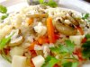 Грибы режем ломтиками, обжариваем на сливочном масле, добавляем к ним куриное мясо, обжаренный лук, мелко нарезанный чеснок, черный молотый перец.