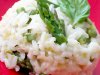 Через пять минут добавляем подготовленный рис, вливаем немного бульона, накрываем крышкой и доводим блюдо до готовности. В готовое ризотто добавляем соус, перемешиваем, посыпаем зеленью и сразу же подаем к столу.