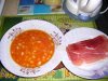 Лук и чеснок мелко порубить, натереть на терке морковку. Грудинку и помидоры нарезать кубиками, сосиски кусочками по 2 – 3 см. положить грудинку на сухую сковородку, вытопить жир. Добавить лук и чеснок, обжаривать до золотистого цвета. положить морковку, через пять минут добавить помидоры, тушить все вместе на небольшом огне минут десять.