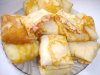 Сковородку разогреваем, смазываем растительным маслом, наливаем немного теста и выпекаем блинчик как обычно – подрумянивая с двух сторон. На готовый блинчик выкладываем слой начинки, сворачиваем рулетом, охлаждаем и нарезаем кусочками.